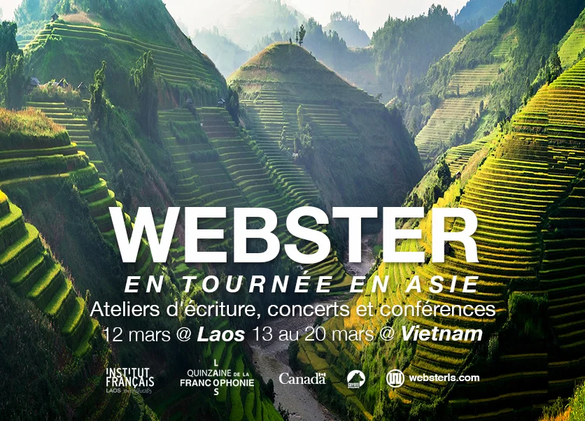 ✚ gCal ✚ iCal Dans le cadre du Mois de la Francophonie, Webster sera en tournée en Asie; il donnera des concerts et des ateliers d’écriture à Vientiane au Laos ainsi qu’à Hanoi et Ho Chi Minh ville au Vietnam.